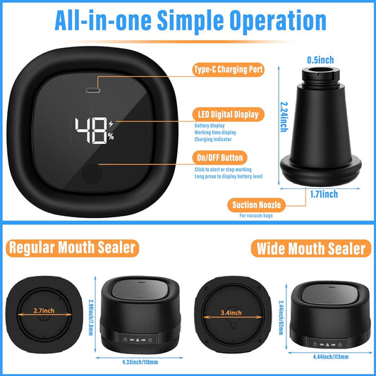 Mason Jar Vacuum Sealer - 3 in 1 Electric Mason Jar Vacuum Sealer Kit for Wide & Regular Mouth Mason Jars Vacuum Bags-Cordless Handheld Vacuum Sealer for Jars Food Storage & Fermentation